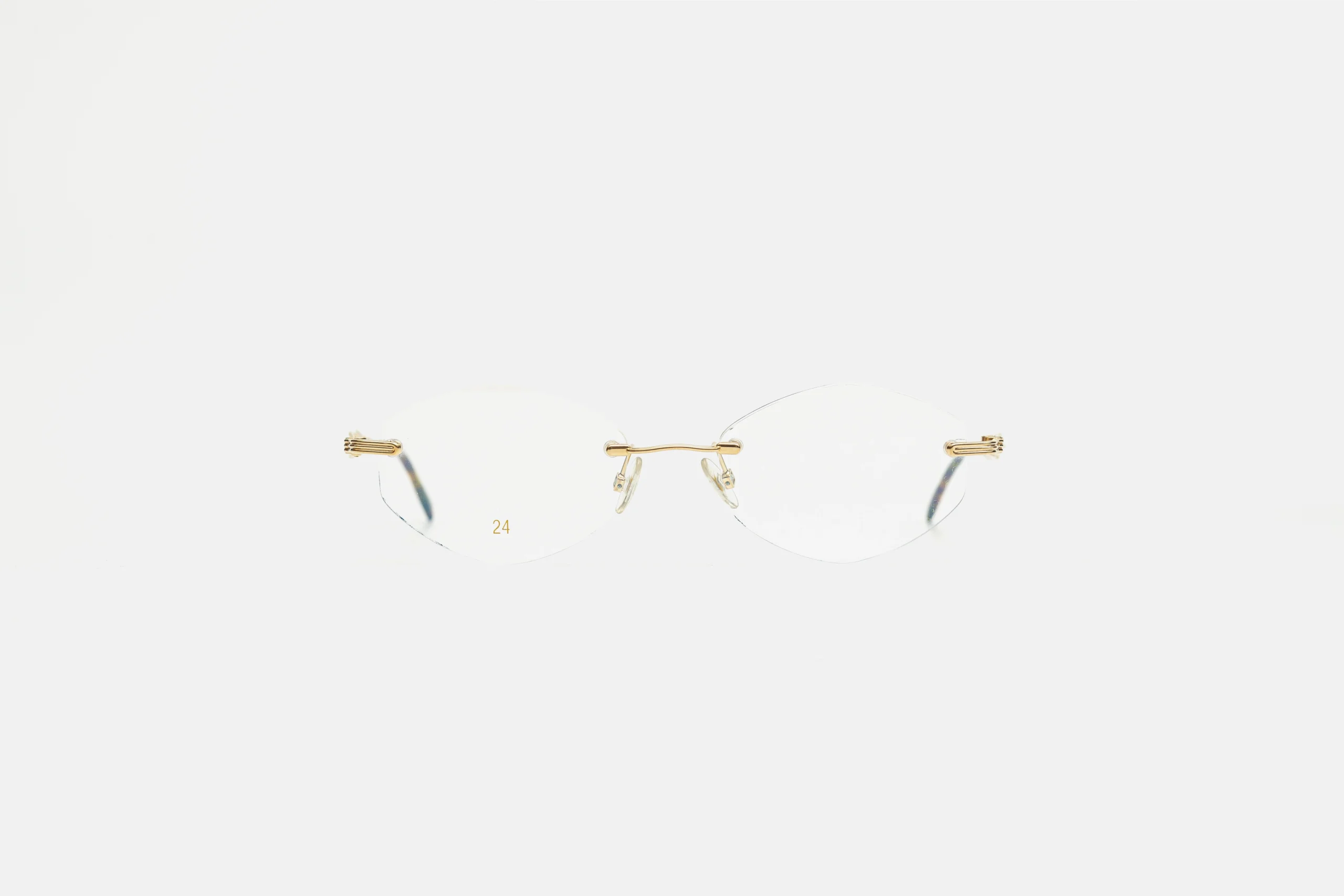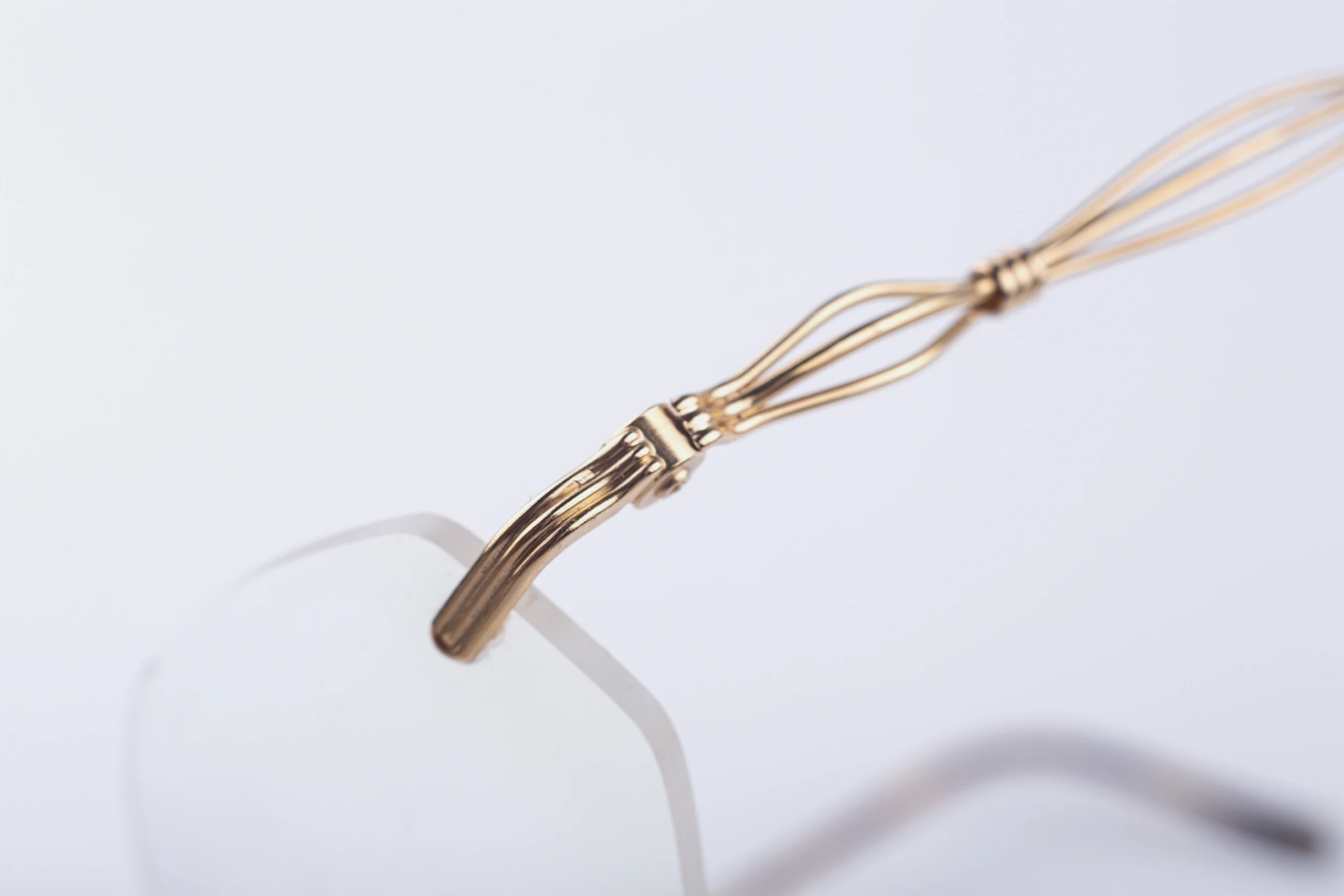 Тонка безободкова конструкція з акцентом на деталях: витончений міст із м’якою дугою та декоративні дужки з характерним плетеним мотивом. Легка, майже невагома посадка — метал лише окреслює контур, залишаючи максимум повітря.