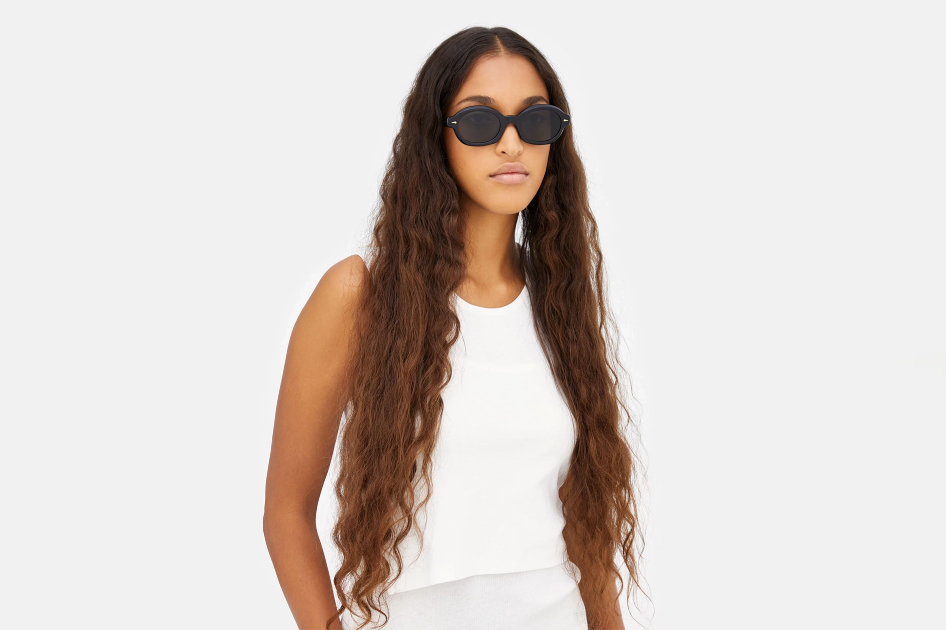 Овальний і компактний, Marzo — це захоплюючий силует у колекції RSF. Модель вирізняється масивними ацетатними обідками, що стали фірмовою рисою RSF, і черпає натхнення у формах 1960-х років із низькими, виступаючими кінчиками дужок та овальними лінзами. Завдяки ручному оздобленню та витонченим дужкам, ці окуляри пропонують свіжий погляд на повсякденні сонцезахисні окуляри. У цій версії модель представлена в чорному кольорі з чорними лінзами Zeiss та золотистими декоративними елементами.