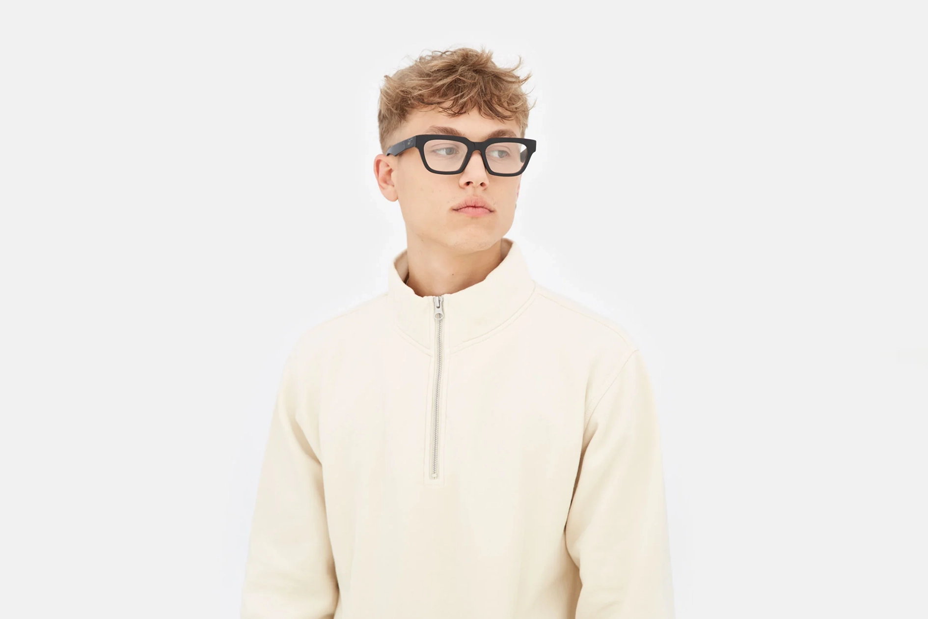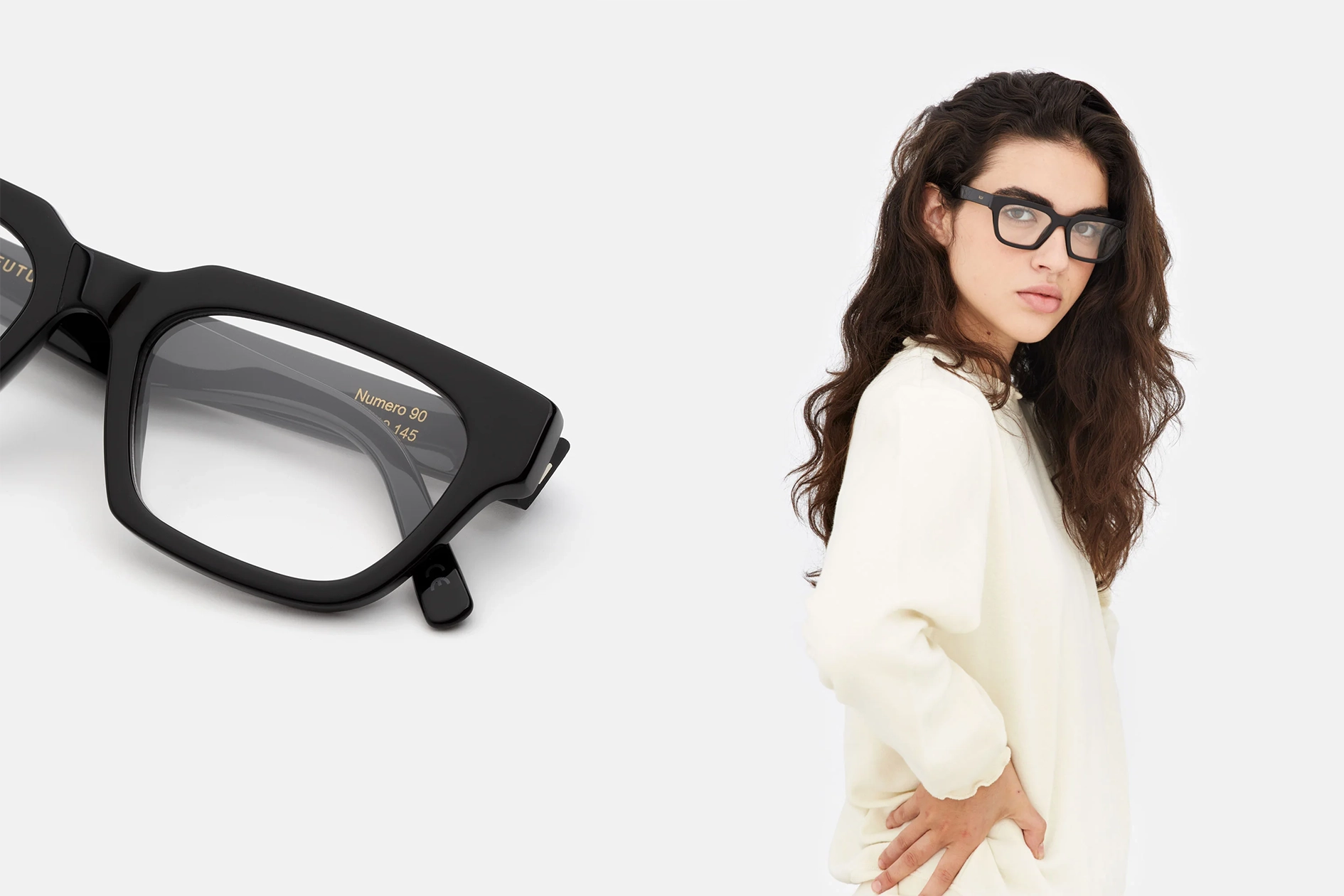 Numero 90 — це виразний сучасний силует із широкою горизонтальною формою. Окуляри вирізняються квадратними лінзами з легкими нахиленими обідком оправи, масивною лінією брів та гострими кінчиками дужок, що підкреслюють їхню унікальність. Ця модель представлена в чорному ацетаті.